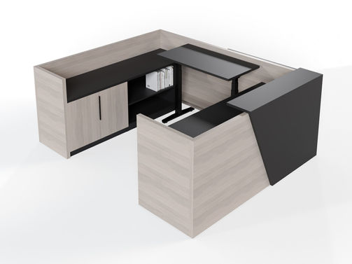 Elevate your workspace. Overture's new era in reception desks – now height-adjustable for the perfect fusion of design, quality, and function. Choose from diverse finishes, materials, sizes, and styles for a tailored introduction to your space.